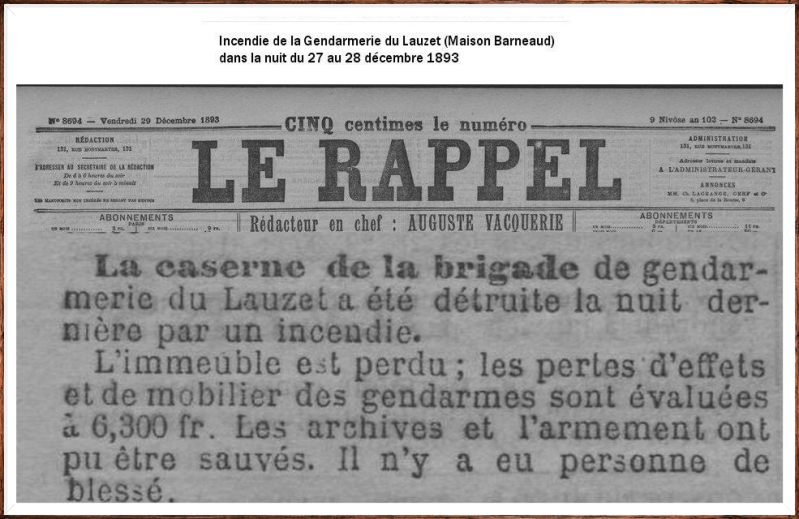 La presse nous apprends que durant la nuit du 27 au 28 décembre1893, un incendie a ravagé la caserne de la brigade de gendarmerie du Lauzet.